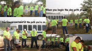 I am very proud of this group of people…all hearts and minds intent on one thing…doing all they can for others…and KEEPING GOD FIRST. They gathered each morning and as Jeff shared the devotions each day and they prayed together, God united hearts and strengthened bodies for the work and sweat ahead!