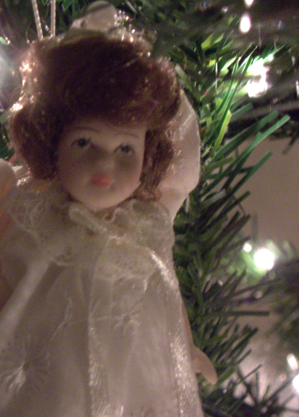 This little brown haired angel is one of two angels. The other one is blonde. I bought both to match our girls. Mother used to do that every time she bought me, Wanda and Aimee dolls. She would match our hair with the doll.