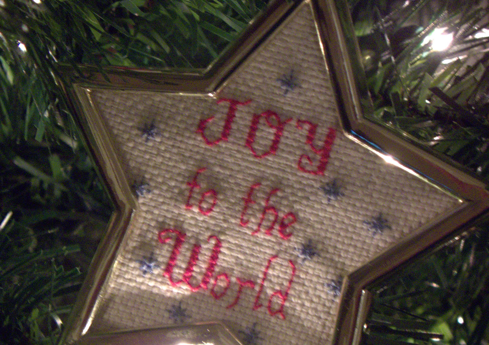 This “Joy to the World” ornament is part of 6 ornaments that my sister, Wanda hand stitched for each of us several years ago.  I have  set, Aimee has a set and mother has a set.  I carefully wrap each one in tissue paper when putting the decorations away each year.  THAT is why it still looks like she just stitched it!