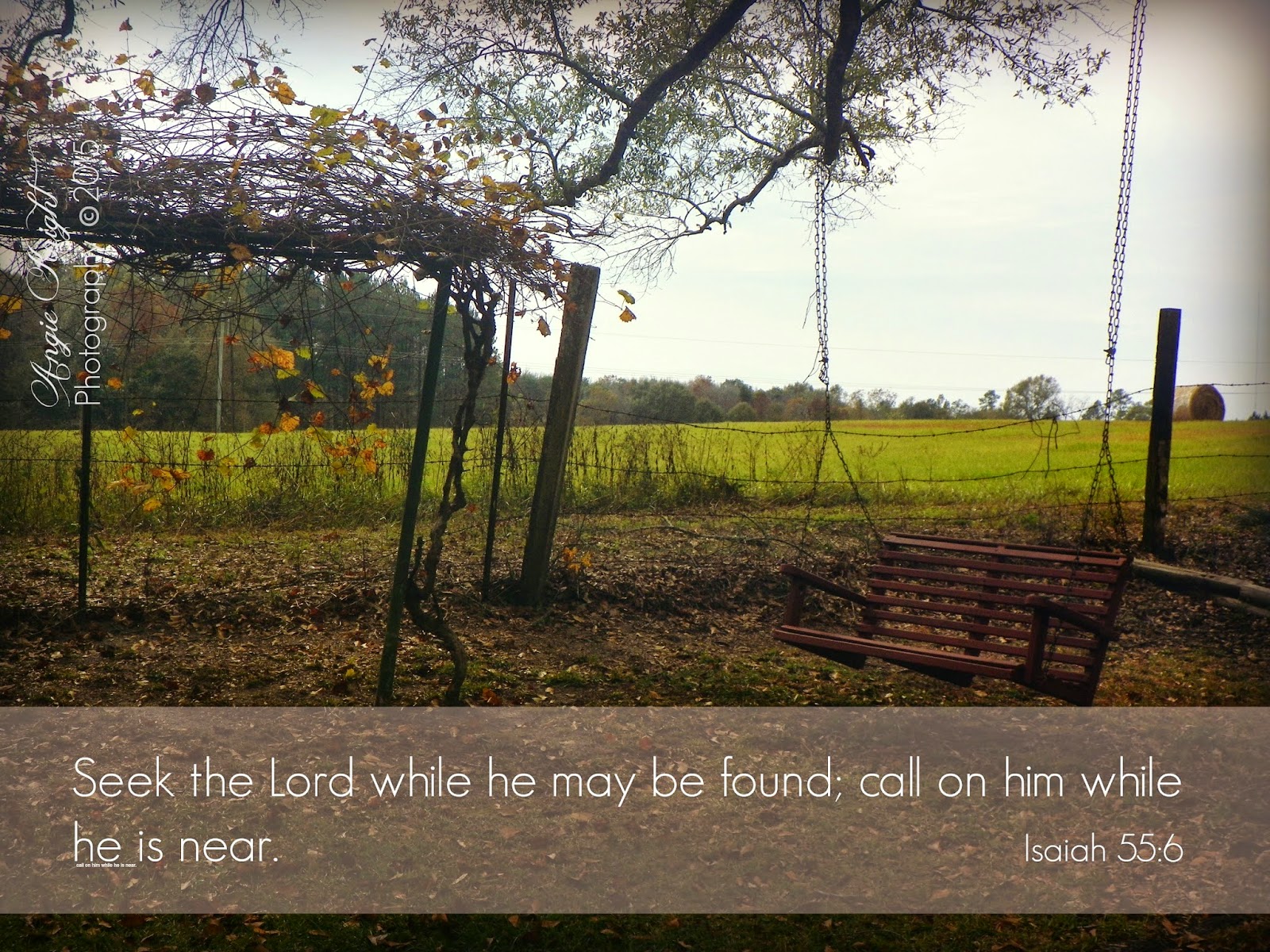 Last night I had worked on a picture that I had taken at my mothers, adding a verse. It’s a sweet spot in her yard for prayer, conversations with children or grandchildren. It’s a teaching place. A swing positioned right in front of their garden plot. Hanging from a huge oak tree, beside a drooping fenced pasture and scupplin’ vine*, an old swing waits.