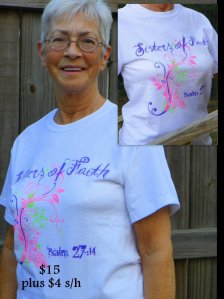 SO–if you would like a shirt, for those that can come get it–or see me at church, it’s $15 for sizes Small to X-large ($18 for any size above X-Large) and the cut of the shirt is a full cut–so it doesn’t fit tight.  Pictured is a size small on my friend, Nancy. If you need it mailed, add $4 for shipping and handling. All proceeds go to Missions for this year.  Make all checks payable to Grace Assembly of God.